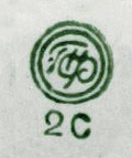Марка зеленая надглазурная штампом ≈ монограмма ╚ПФ╩ в двойном круге. Внизу ≈ ╚2с╩ (второй сорт). Изображена на фарфоровой чашке (111 х 91 х 95 мм). Датировка предмета: начало 1990-х.