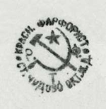 Марка черная надглазурная штампом ≈ скрещенные серп и молот со звездой и монограмма ╚Р.Ф.Т.╩ (Росфарфортрест) в круговой надписи ╚КРАСН. ФАРФОРИСТ. СТ. ЧУДОВО ОКТ. Ж.Д.╩. Изображена на плоской фарфоровой тарелке (диаметр ≈ 184 мм). Датировка предмета: 1930√1934-й.