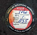 Бумажная наклейка ≈ изображение белого горшка на красном фоне с надписью ╚RIGA╩. По кругу, на черном фоне, надписи ╚MAKSLAS KERAMIKAS DARBNICA╩ (художественная керамическая мастерская) и ╚LPSR (то есть Latvijas Padomju Socialistiska Republica) MAKSLAS FONDS╩ (художественный фонд ЛССР). Наклеена на майоликовой вазочке (высота ≈ 62 мм; диаметр ≈ 60 мм). Датировка предмета: 1958√1959-й.
