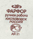 Марка красная по бисквиту штампом ≈ стилизованная буква ╚Ф╩ и надписи ╚ФАРФОР╩, ╚ручная работа╩, ╚Кисловодск╩, ╚Россия╩. Ниже: знак российского стандарта и его номер. Изображена на фарфоровой вазе (диаметр ≈ 117 мм; высота ≈ 250 мм). Датировка предмета: 2004-й.