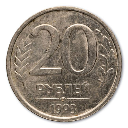 20 рублей. ЛМД. 1993.  Медно-никелевый сплав (не магнитный). Вес 5,30 г. Самая редкая монета переходного периода новой России. На аукционе продается впервые. Эстимейт 120 000√150 000 рублей. ╚Коллекционные русские монеты и медали╩. Фирма ╚Монеты и медали╩. Москва, 14 апреля