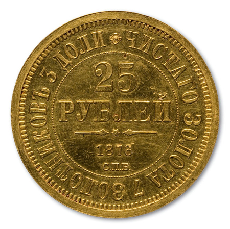 25 рублей 1876 г. Тираж 100 экземпляров. Золото, 32,63 г. Сохранность почти отличная, штемпельный блеск. Очень редкие. Эстимейт