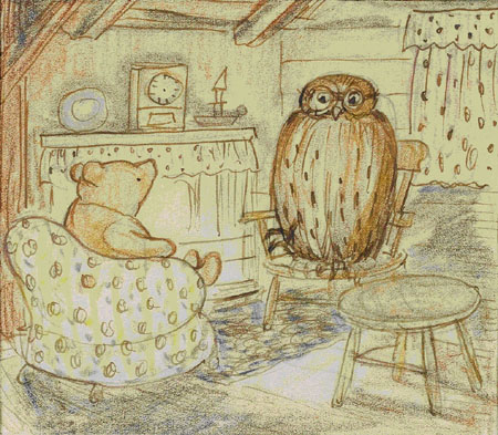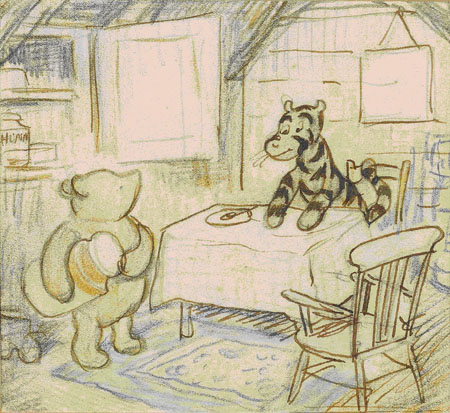 Иллюстрация ╚Тигры не едят мед╩, выполненная в технике пастели, была нарисована художником для издания ╚Мир Пуха╩ в 1958 г., но не пошла в печать. Долгое время рисунок оставался у художника, пока его не приобрела Салли Хантер для галереи Fine Art, а позже он оказался в частной коллекции. Владелец этого рисунка решил также выставить на торги и вторую работу художника √ ╚Пух в гостях у Совы╩. Рисунок, выполненный чернилами и цветными карандашами, был опубликован в 1929 г.